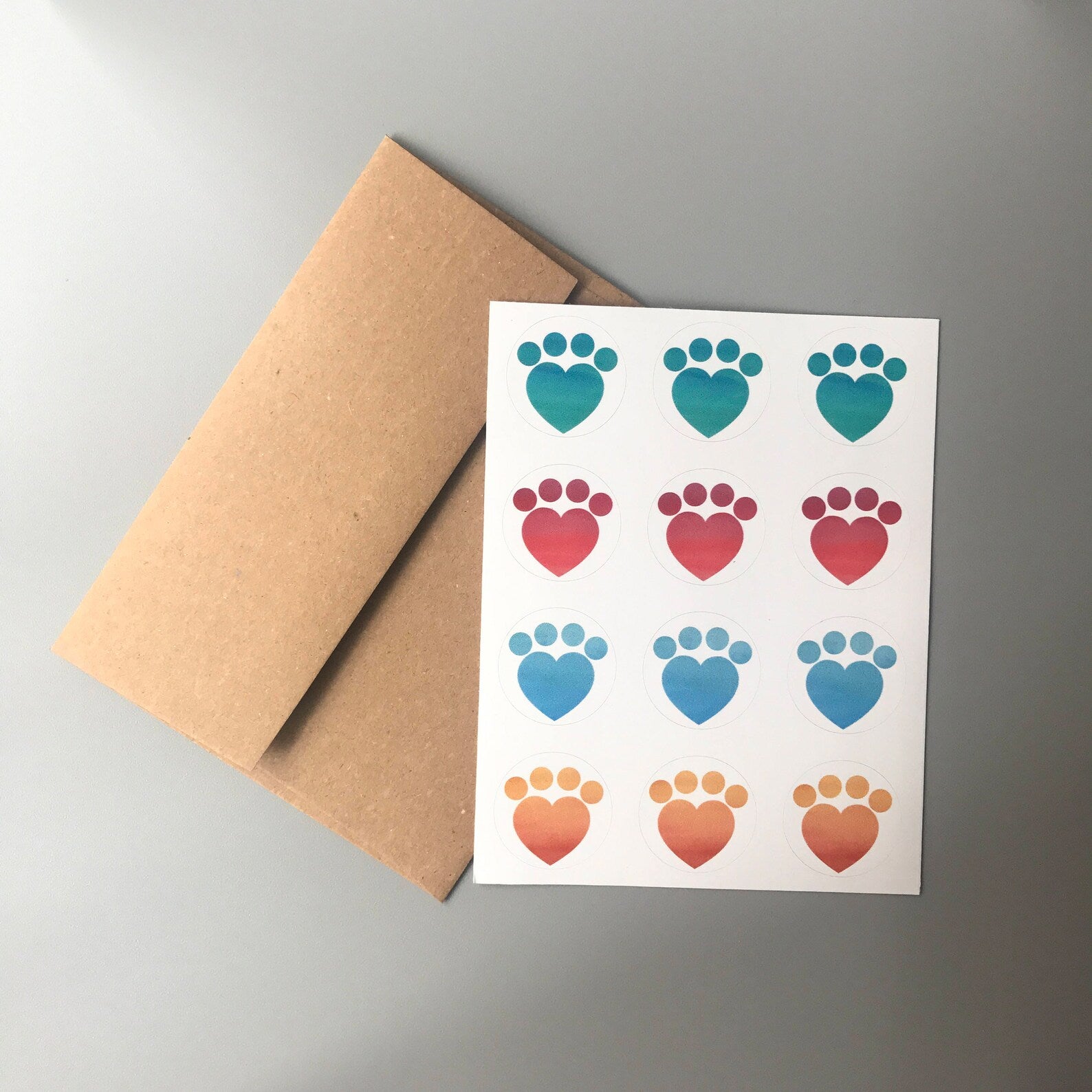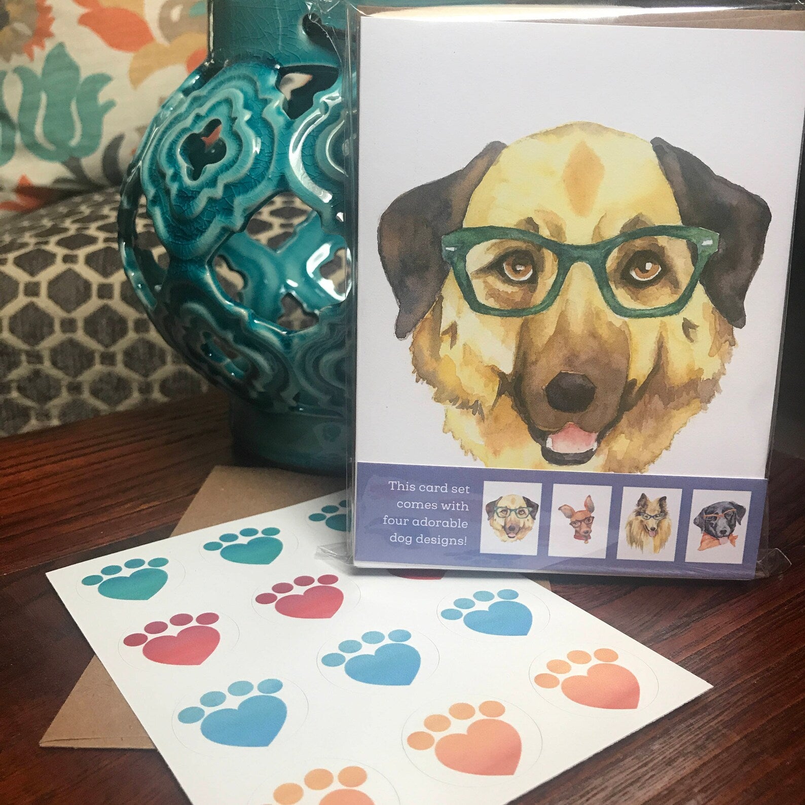 Each set of 12 A2 sized cards includes four doggie designs accompanied by matching heart paw print envelope seals and craft paper envelopes.