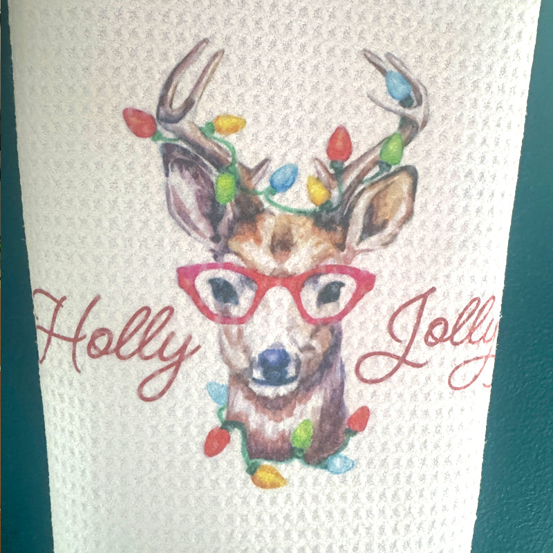 Make your kitchen merry and bright with this new Holly Jolly Reindeer in Glasses towel! Enjoy this festive watercolor design on a waffle weave hand towel. Perfect to give as a gift or keep for yourself this holiday season.